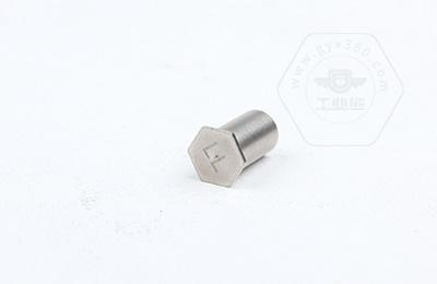 通過(guò)壓力機(jī)將六角頭壓入薄板的預(yù)置孔內(nèi)(預(yù)置孔的孔徑一般略大于壓鉚螺柱的圓柱外徑)使孔的周邊產(chǎn)生塑性變形,變形部分被擠入壓鉚螺母柱的退刀槽內(nèi),使壓鉚螺母柱鉚緊于薄板上,從而在薄板上形成一下有效固定的內(nèi)螺紋。